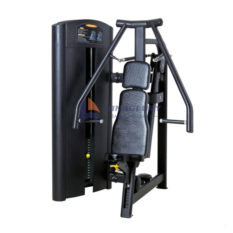 Регулирайте седалката, така че дръжките да са подравнени с горната част на гърдите. Поставете подходящото тегло, седнете здраво с глава, горната част на гърба и бедрата срещу облегалката и ангажирайте сърцевината. Дръжте гърдите си вдигнати и очи напред. Хвърлете дръжките, вдишвайте дълбоко и натиснете напред с активиране на гърдите, докато издишвате. Не заключвайте напълно лактите. Пауза за кратко в горната част, след което бавно се върнете, докато вдишвате. Повторете движението с контролирана форма.